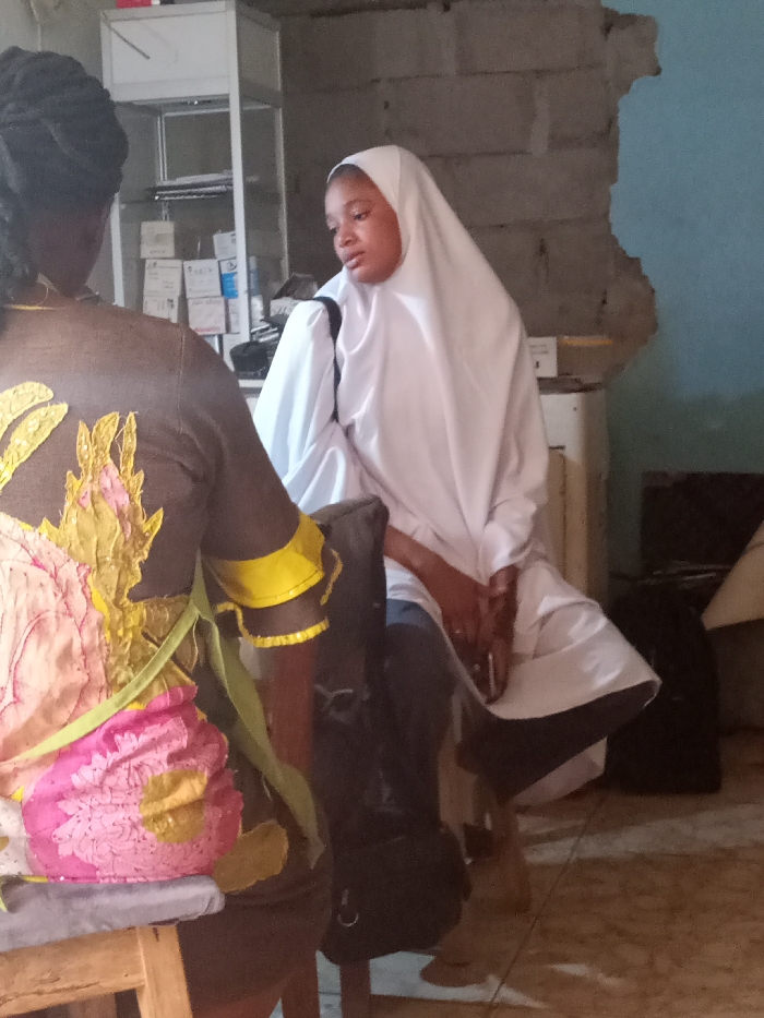 A woman in a brown and pink floral-patterned dress with yellow sleeve accents sits to the left. Next to her, a young woman in a white hijab and jeans sits with her hands clasped. A black bag leans against their chairs. Behind them is a room with a medical cabinet and a damaged wall.