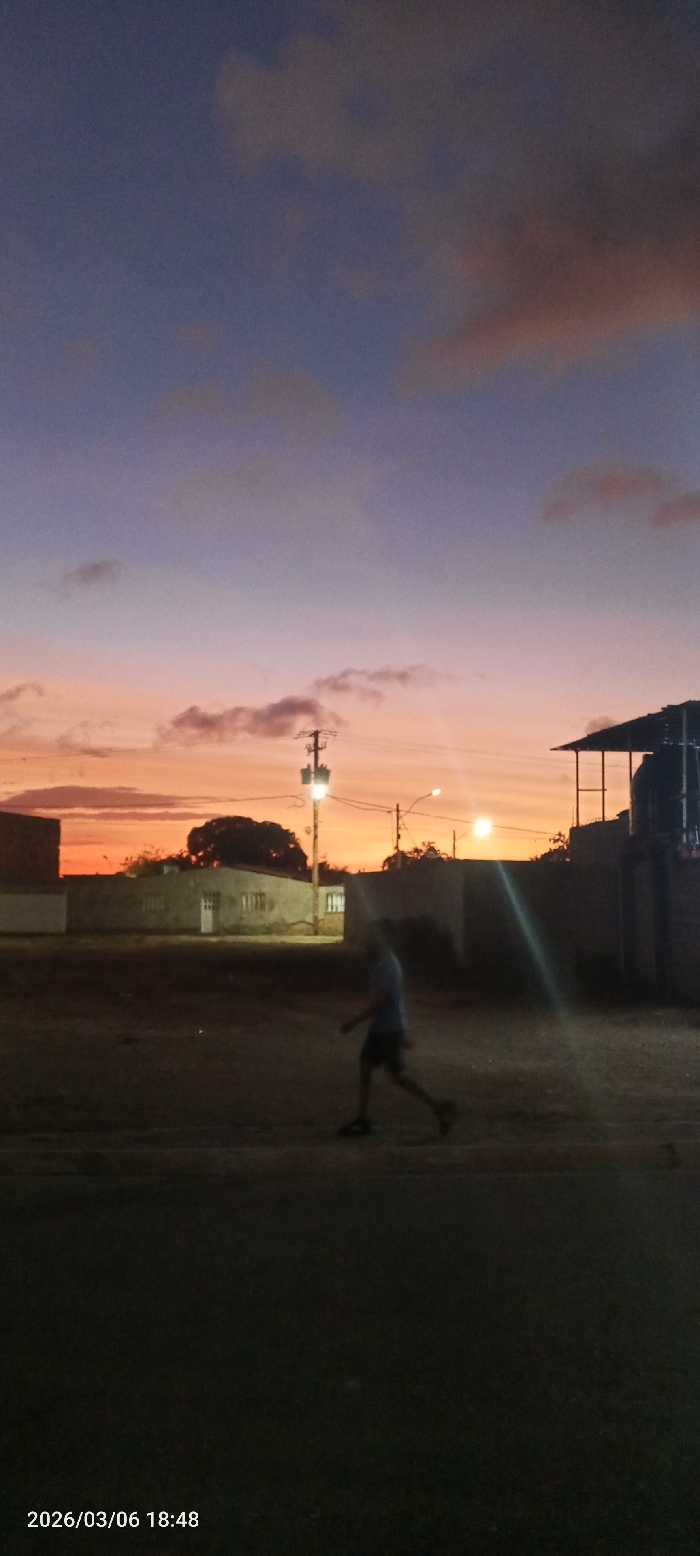 A low-light, vertically oriented image captures a residential street scene in Altagracia, Venezuela, at dusk on March 6, 2026, at approximately 18:48. The sky transitions from a deep purple at the zenith to a vibrant orange and red above the horizon, with scattered dark clouds. In the mid-ground, a single individual, blurred by motion or low light, walks from left to right across a dark, unpaved area. The person is dressed in a light-colored shirt and dark shorts with dark shoes. The environment features several single-story structures. On the left, a light-colored building with a flat roof is visible. To its right, another light-colored building with a dark roof displays a prominent door and windows, some of which are illuminated from within. Further right, a dark wall-like structure precedes a building with an open, perhaps corrugated, roof supported by posts, behind which a dark cylindrical object, possibly a water tank, is visible. Two utility poles are present, each equipped with a glowing streetlamp. The left pole's lamp is centrally prominent, casting light downwards. A large, dark tree with dense foliage is silhouetted against the sunset, positioned behind the central utility pole. The foreground consists of a dark asphalt road with a visible curb separating it from the unpaved area.