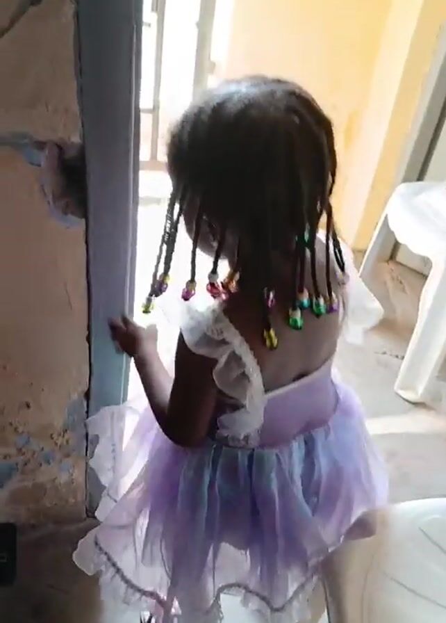 young child dressed in a purple and white dress. The child has dreadlocks with colorful beads. The child is standing in what appears to be a doorway. A white plastic chair is visible behind the child. The child touches the wall briefly. The child looks around. Music is playing in the background.