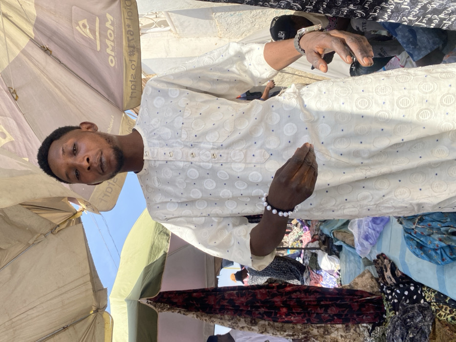 An adult male stands centrally in an outdoor market setting in Sabon Gari South, Nigeria, looking directly towards the camera