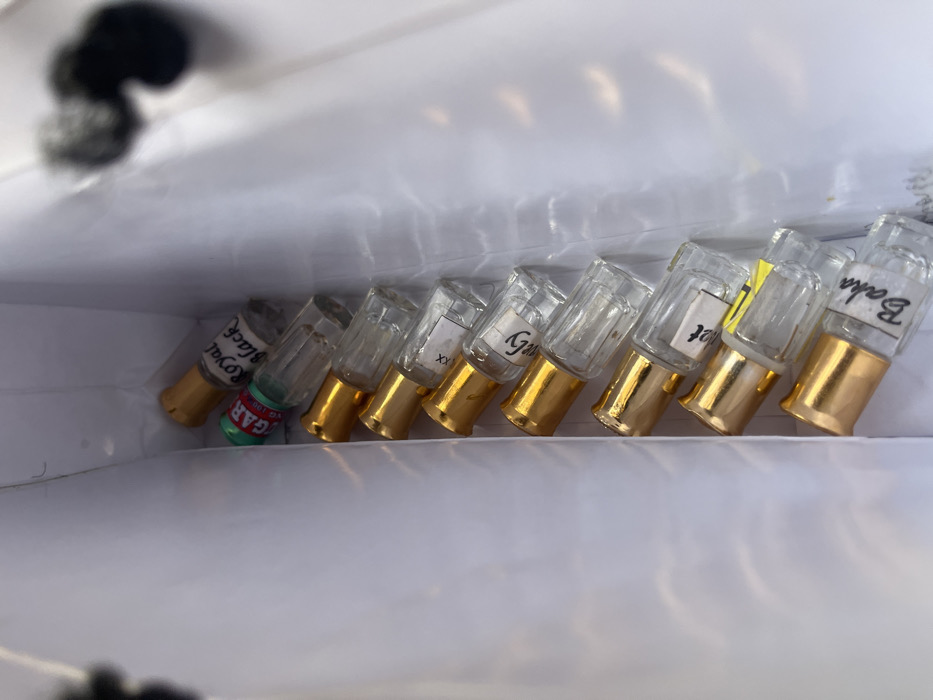 The image displays approximately thirteen small, clear glass vials, primarily with gold-colored caps, arranged diagonally within a white bag or container