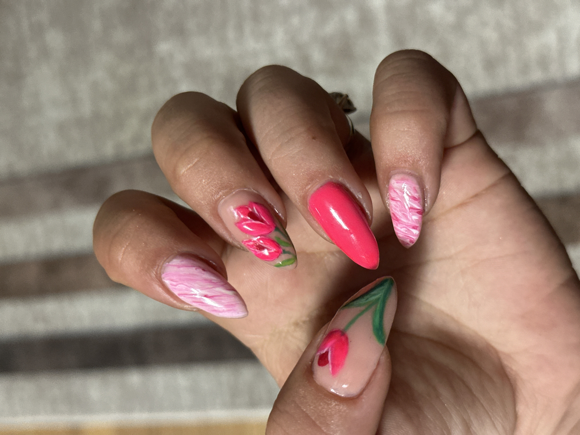 The image displays a human hand, likely female, positioned with the palm facing towards the viewer's lower left, showcasing painted fingernails. The hand has a light-to-medium skin tone. Five fingers are visible, each adorned with a distinct nail art design on extended, almond-shaped artificial nails. Specifically: - The thumb and pinky fingernails feature a swirled design of light pink and white. - The index fingernail has a single vibrant pink tulip with a green stem and leaves painted on a clear or natural-toned base. - The middle fingernail displays two smaller pink tulips with green stems and leaves, also on a clear or natural-toned base. - The ring fingernail is painted a solid, bright, opaque pink. A silver-toned ring is visible on the ring finger, partially obscured. The background is uniformly out of focus, consisting of a light-colored, possibly textured surface, appearing grey or beige with subtle variations in tone. On the left side of the image, faint vertical stripes are discernible in the blurred background. The lighting is direct, illuminating the hand and nails without harsh shadows. The location in the city of Skala, Bulgaria, cannot be determined from the visual information provided in the image.