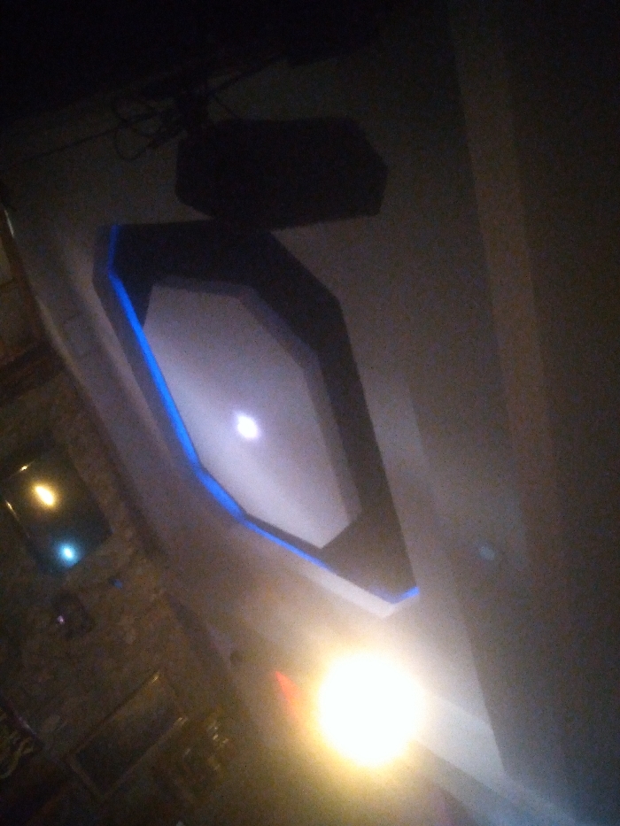 The image displays an indoor environment in Ado, Nigeria, under dim lighting conditions. The ceiling features a prominent recessed light fixture, which appears hexagonal or octagonal in shape, outlined by a visible blue LED strip. A single, bright white light source is centrally located within this fixture. Above and slightly behind this fixture, a dark, rectangular object, possibly a speaker or projector, is mounted on the ceiling, with associated wiring visible. To the right, a plain, light-colored wall is present. On the left side of the frame, a darker, textured wall is visible, on which a dark, rectangular screen or monitor is mounted, reflecting two distinct light sources—one yellowish and one bluish-white. A very bright, intense yellow-white spherical light source dominates the lower right foreground, causing significant lens flare. No individuals, specific actions, or interactions are discernible within the frame.
