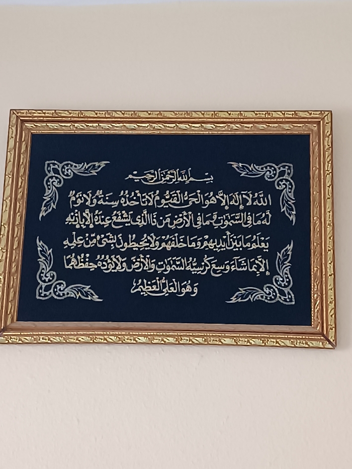 A rectangular framed artwork is centered on a plain, light-colored interior wall. The frame is gold-toned with an embossed, ornate pattern. The artwork within displays light-colored Arabic calligraphy, identified as Ayat al-Kursi, against a dark blue background, likely a fabric. Stylized scrollwork in the same light color as the script decorates the corners of the calligraphy panel. No individuals, actions, or interactions are present in the scene. The specific location within the city of Unknown, Unknown, cannot be determined from the visual evidence.