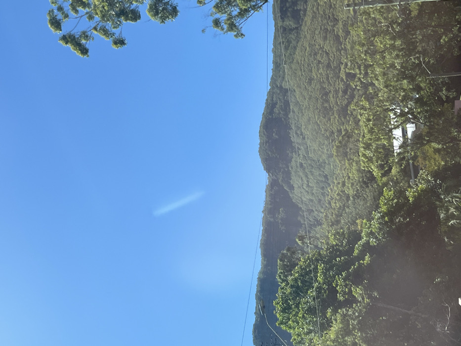 A daytime landscape features a clear blue sky filling the majority of the frame, contrasted by a lush, green mountain range on the right. Power lines are visible against the mountain. Tree branches overhang the top of the image. The composition is slightly tilted, and there is a faint white line visible in the sky. Some sunlight glares at the bottom of the image.
