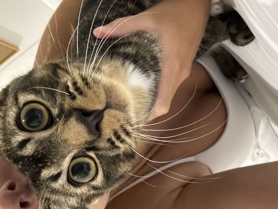 A close-up, high-angle perspective captures a domestic tabby cat with brown, black, and tan striped fur, held by an unseen individual. The cat's face, central to the image, displays large, dilated pupils, a dark nose, and prominent white whiskers. A patch of white fur is visible on its lower jaw and chest. The person holding the cat is partially visible, with their forehead and a portion of their upper face in the upper left quadrant. Their hands cradle the cat, and they are wearing a white spaghetti-strap top, with cleavage visible. The immediate background shows white fabric, consistent with bedding. A light-colored, textured object, potentially wood or rattan, is partially visible in the upper right background, suggesting interior decor. The scene is situated indoors, within a residence or accommodation in Canggu, Indonesia.