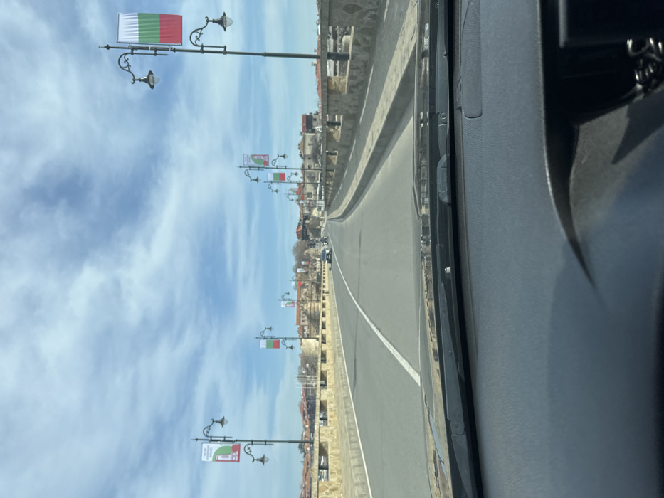 The image depicts a daytime scene from the interior of a vehicle, looking forward over the dashboard and through the windshield. The vehicle is situated on a multi-lane causeway or bridge leading towards the historic city of Nesebar, Bulgaria. The foreground is dominated by the dark gray dashboard and windshield wipers. Beyond the windshield, a two-lane asphalt road is visible, with a solid white line delineating the opposing traffic lanes. The road curves slightly to the right in the distance. On both sides of the road, a low, light-colored stone barrier or wall is present. Lining both sides of the road at regular intervals are black, ornate lampposts, each featuring two light fixtures. Multiple lampposts display vertically hung banners. Some banners are the national flag of Bulgaria, characterized by horizontal stripes of white, green, and red from top to bottom. Other banners are red and green with white text and a circular graphic, possibly advertising or informational. In the midground and background, the ancient architecture and buildings of Old Nesebar are visible. These include stone structures, remnants of old fortifications or walls, and buildings with red or terracotta roofs. Several vehicles, appearing to be passenger cars, are visible in the distance on the road, traveling in the same direction as the viewpoint vehicle. The sky is partly cloudy, featuring distinct white cumulus or stratocumulus clouds against a clear blue sky. No individuals are clearly discernible in the scene.