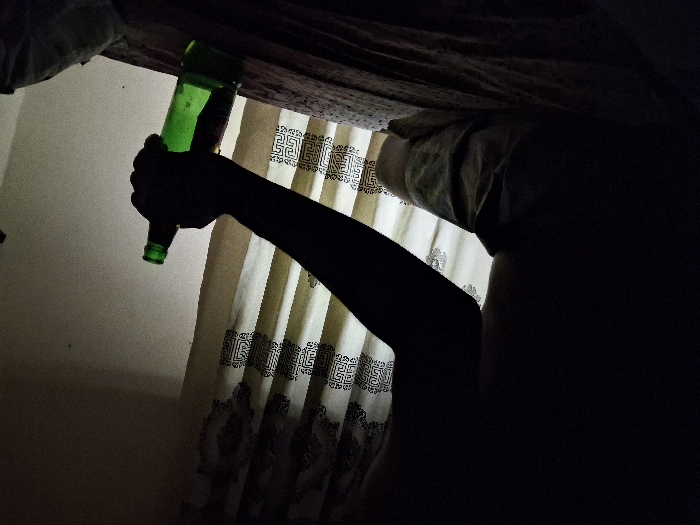 The scene depicts an indoor environment in Howayi, Nigeria, under dim lighting conditions. A person is partially visible in the foreground, largely silhouetted, seated or reclining on a dark, patterned surface that appears to be a bed. The individual's bare upper torso, left arm, and a portion of their left leg, clad in light-colored shorts or underwear, are discernible. The person holds a green glass bottle vertically in their left hand. In the background, a light-colored curtain with a dark, repeating geometric pattern covers a window area, with a plain, light-colored wall segment visible to the right. The primary light source emanates from behind the curtain, creating a strong silhouette effect on the foreground subjects.