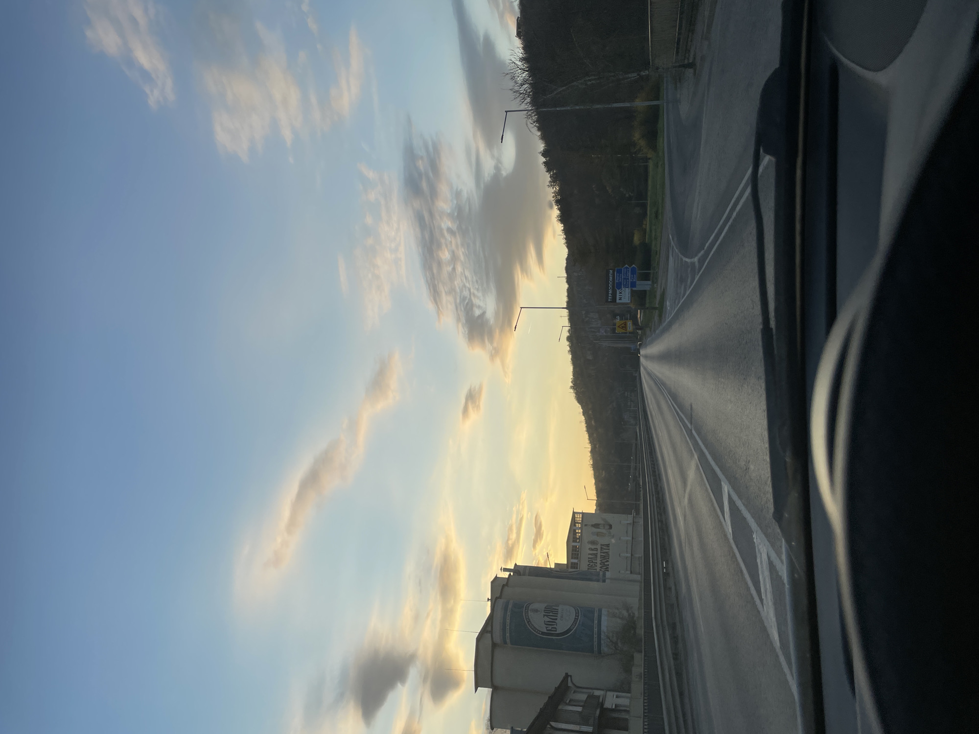 view from inside a vehicle, looking out onto a road in Veliko Tarnovo, Bulgaria. The road stretches into the distance, flanked on one side by a forested hill and on the other by industrial buildings, including those of "GOZHDIN" brewery. A signpost is visible with directional information. The sky is partly cloudy with a golden hue, suggesting either sunrise or sunset. The inside of the vehicle is visible on the edges of the frame.