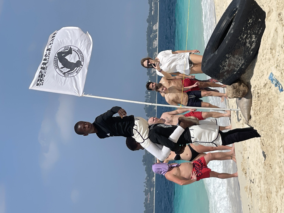 The image depicts a sunny beach scene in Zanzibar, Tanzania. In the foreground, two Black males are engaged in a piggyback ride; the lower individual, wearing a black long-sleeved shirt, white shorts over black leggings, and bare feet, carries the upper individual, dressed in a black long-sleeved shirt and white shorts, who looks left. To their right, a white flag on a pole displays the "SPARTAN NEVER SURRENDER" logo with a backflipping silhouette and "2026." Behind these figures, on the sandy shore, a group of five Caucasion individuals stands near the turquoise ocean waterline. From left to right: a man with a purple cloth over his head wearing red shorts; a woman in a black bikini bottom; a shirtless man in red shorts; two shirtless men in dark and red shorts respectively, standing near a yellow line on the sand. The last individual on the right is a woman in a white t-shirt and dark shorts, holding a white smartphone horizontally, seemingly recording. In the lower right foreground, a large, worn black tire is partially buried in the sand, alongside a piece of wood or debris and some blue plastic litter. The background features a clear blue sky and a distant green coastline across the deep blue ocean.