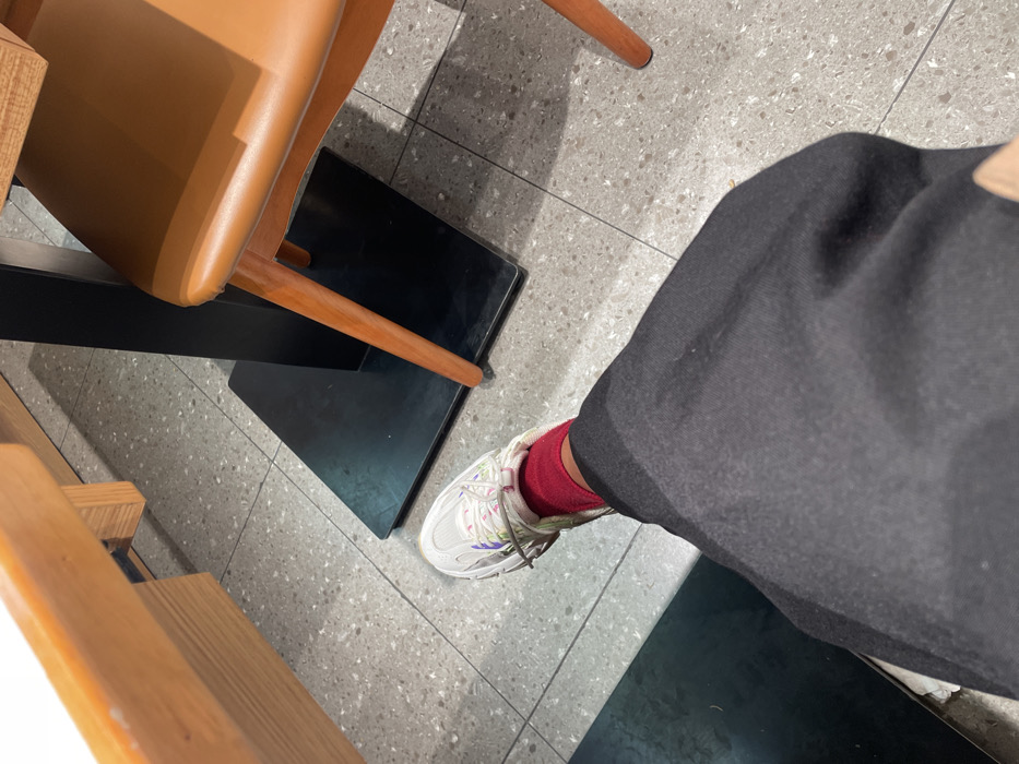 The image presents a ground-level view within an indoor establishment in Daxing District, China. The lower left leg of an individual is visible, extending from the bottom-left toward the center-left. The leg is clad in dark trousers, a vibrant red sock, and a white athletic shoe featuring multi-colored lacing elements. The foot rests on a light grey terrazzo-tiled floor with visible grout lines. Furniture components are arranged around the foot: a light brown wooden table base is visible in the upper-left, and a brown upholstered chair with wooden legs is situated to the right. A prominent black metal table base with a flat rectangular footing stands between the visible wooden furniture elements. The scene is illuminated by an unseen light source, casting subtle shadows.