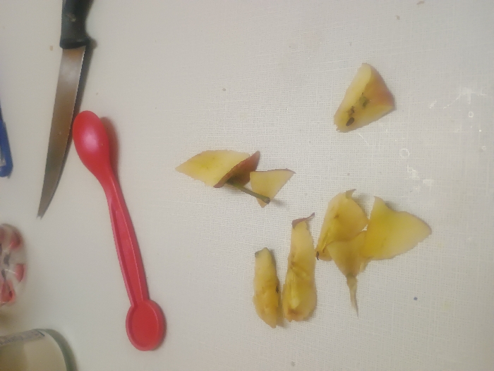 The scene, located in Levice, Slovakia, depicts a white, textured countertop or cutting surface. Scattered across the surface are multiple irregularly shaped pieces of yellowish-brown apple peel and core remnants, some exhibiting reddish skin and one piece clearly containing black seeds. A red plastic spoon with a circular end lies horizontally on the upper left portion of the surface. Above the spoon, a silver-bladed kitchen knife with a black handle is positioned diagonally, its blade pointing towards the upper right. In the blurred background, a clear glass jar with a white lid and a blue object are partially visible. No individuals are present.
