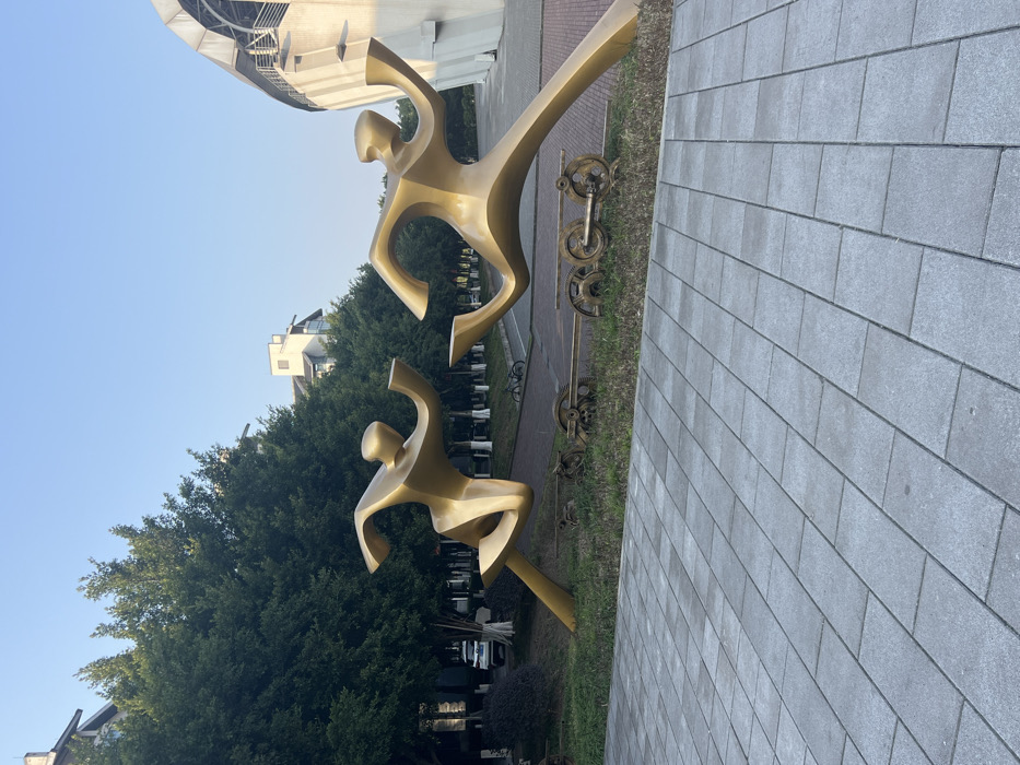 - "A clear daylight scene in Jiangjin, China, displays two prominent, golden, abstract human figures in dynamic running poses, centrally located on a grassy median" by FM-Q07Ys2, licensed under CC BY 4.0