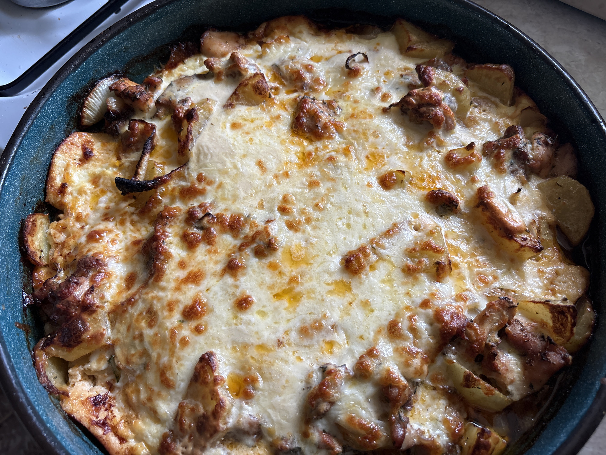 A high-angle, close-up photograph displays a freshly baked casserole dish in a round, dark teal or deep blue pan. The dish contains layered ingredients, predominantly wedge-cut potatoes, visible along the perimeter and interspersed throughout, some retaining their skin and showing golden-brown edges. Chunks of browned meat, possibly chicken or pork, are scattered among the potatoes. Distinct mushroom pieces, including one with visible gills on its underside, are identifiable. The entire surface is covered by a melted cheese layer, characterized by irregular browning and bubbling, with glistening rendered fat visible in several areas. The pan rests on a light-colored surface, likely a kitchen countertop or stovetop, with a partial view of a white ceramic or enamel surface and a black burner grate element in the upper left background. The scene is located in Gorna Rositsa, Bulgaria. No individuals or active interactions are depicted.