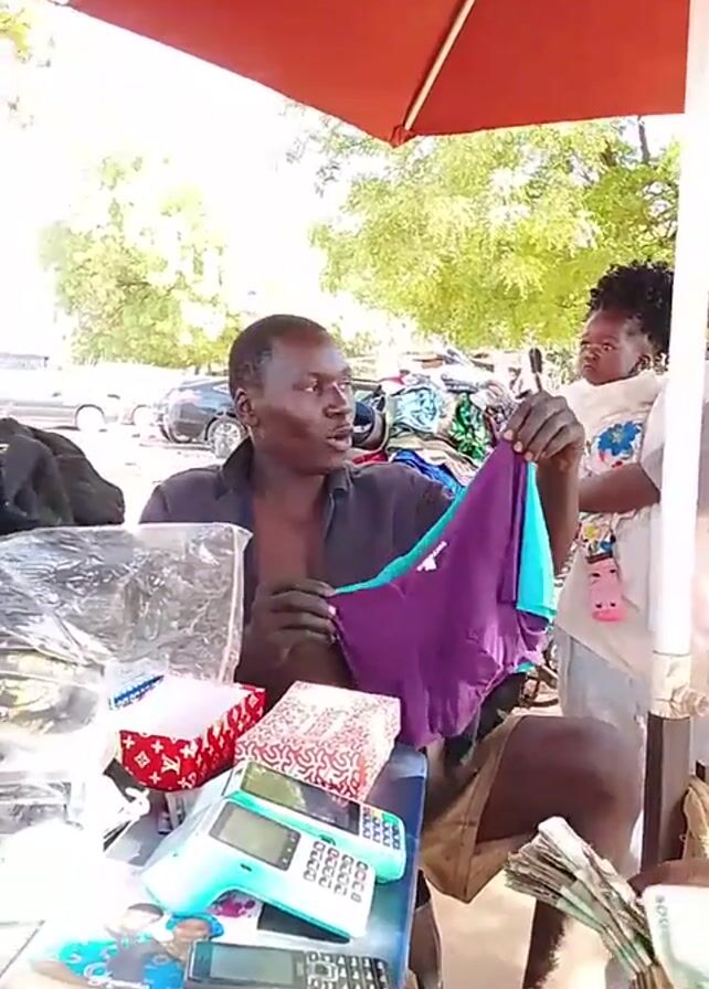 A man is selling underwear at an outdoor market. He holds up a pair of purple and blue underwear to show a customer. The vendor is sitting behind a blue table with several items including two blue card readers, money, and various merchandise. Two other people stand by the table looking at the merchandise. The scene is sunny and outdoors under a red umbrella.
