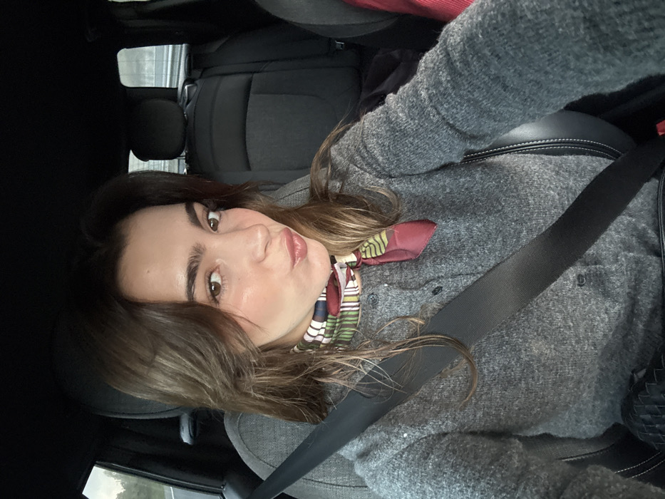 A woman with brown hair and light skin sits in a car, wearing a gray cardigan. She is secured with a seatbelt. A colorful scarf adorns her neck. The interior of the car features black seats and panels. The image is taken from a slightly angled perspective, close to the woman's face, and appears to be a selfie.