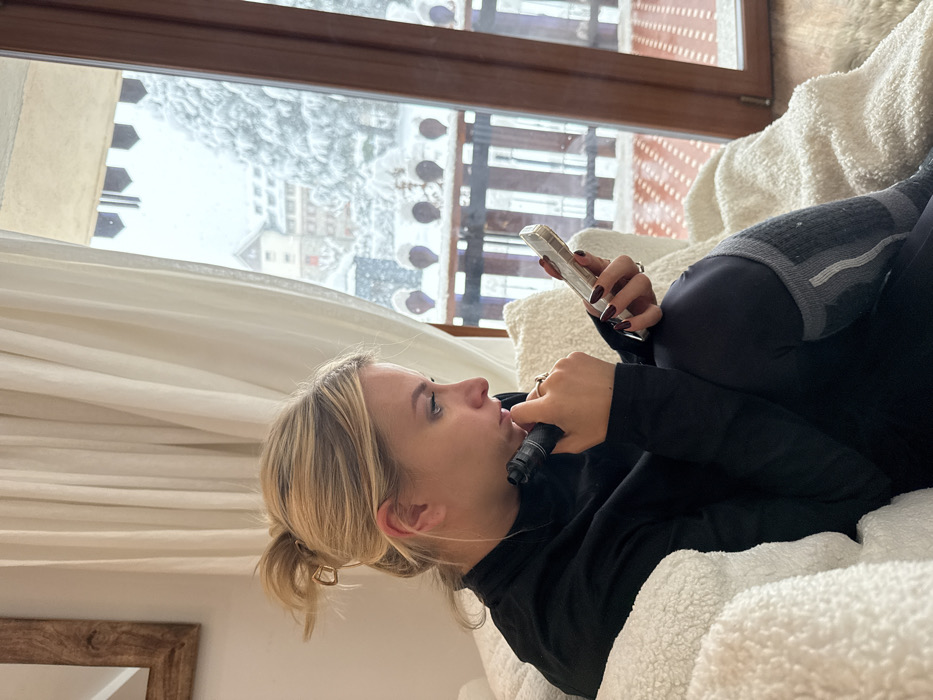 An adult female is depicted indoors, seated on a white, textured armchair within a setting in Limone Piemonte, Italy. She has blonde hair gathered in a messy bun, secured with a gold-colored claw clip. Her attire consists of a black long-sleeved top, dark leggings, and grey-and-white striped socks. She wears multiple gold-toned rings on her fingers, and her nails are painted dark red. In her right hand, she holds a light-colored smartphone, possibly an iPhone in a clear case, and is actively viewing its screen. Her left hand holds a black, cylindrical vape device near her mouth. Behind her, a large window reveals a snowy outdoor landscape. Directly outside the window, a wooden balcony railing with decorative balusters is partially covered in snow. Beyond the balcony, snow-covered evergreen trees and distant multi-story buildings with gabled roofs are visible under an overcast sky. Off-white curtains frame the window on the left, and a wooden-framed mirror is partially visible on the left wall of the interior.