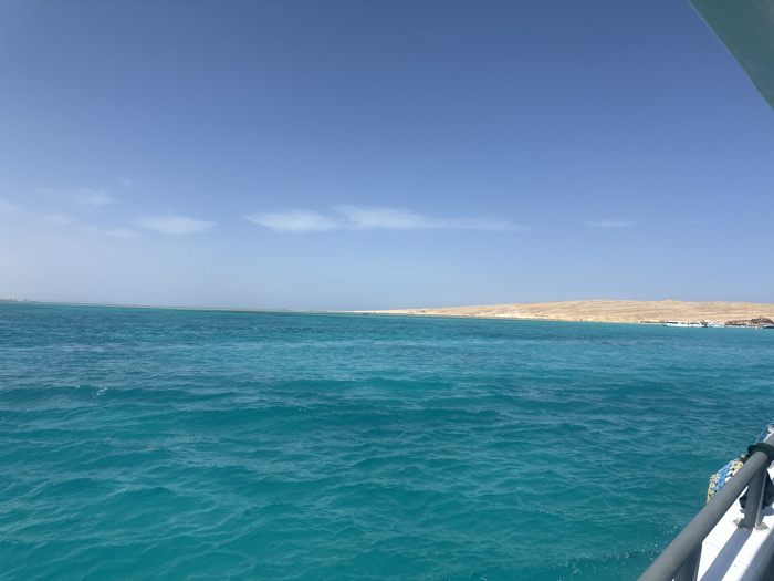 This image displays an open marine environment captured from a boat in the Red Sea, near Hurghada, Egypt