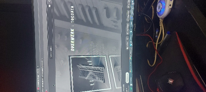 The image displays a computer workstation in Tashkent, Uzbekistan. A black NIWA-branded computer monitor, positioned centrally, shows a web browser with multiple tabs open, including a YouTube page. The main browser content features the text "OVERWERK : TOCCATA" against a grayscale background suggesting musical instrument keys. To the left of this text, a thumbnail image of a black music synthesizer or MIDI controller is visible. Below the monitor, a black desk surface is partially visible, showing various items. These include a black gaming mouse with a red logo resting on a black mousepad with a red edge, a blue ballpoint pen, and a white/silver circular electronic device with a glowing blue light. Several entangled cables, primarily red, yellow/beige, and black, are also present on the desk surface. No individuals are depicted in the scene.