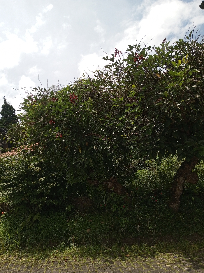 The image displays an outdoor scene in Cimacan, Indonesia, under a partly cloudy sky. The upper third of the frame shows a mix of white and grey cumulus clouds and lighter sky patches. The midground and background are dominated by dense, vibrant green foliage comprising a large mass of trees and bushes. Scattered clusters of deep red flowers or berries are present within this foliage, notably towards the upper left and central regions. Green fern fronds are visible growing among the other vegetation in the lower-middle section. A dark green, conical coniferous tree is partially observed on the far left. A section of a terracotta-colored tiled roof is faintly visible through the dense greenery on the left side of the midground. The foreground consists of a dark, textured paved surface, appearing to be interlocking pavers or cobbles, with sparse green moss or small weeds in the cracks. Immediately behind this paving lies a strip of uneven ground covered with green grass and dirt. No individuals, animals, or discernible actions are depicted.