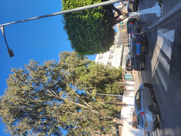 street scene in Bir Mourad Raïs, Algeria. There is a silver Ford Fiesta driving across a crosswalk in the lower left portion of the image. Several other vehicles are stopped or moving slowly in the street, including a dark blue Suzuki Alto, a gray Renault Megane, a silver Toyota Corolla, and a white Toyota Land Cruiser. The street is bordered by trees on either side. One tree is in the foreground of the image. The street is lined with buildings, with a white wall on the left and a building with a green awning on the right. There are a few people visible in the distance, walking or standing near the buildings. The sky is a clear blue.