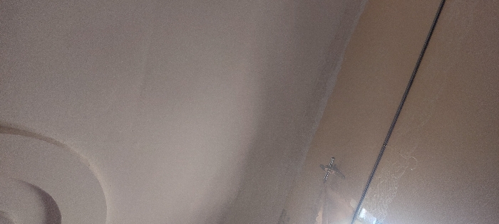 Location: Mosop ward, Kenya. The image presents an interior view of a room, likely a bathroom or wash area, characterized by textured, light-colored surfaces. The upper-left quadrant features a light beige ceiling with a series of subtle, concentric curved architectural indentations or molding details. To the right, a vertical light brown wall is visible, exhibiting a textured finish. A thin, dark, vertical line, consistent with a grout line or a seam in the wall surface, extends diagonally from the upper right toward the lower center of this wall. In the lower-left section of the wall, a chrome-plated metallic fixture, appearing to be a multi-nozzled shower head or water outlet, is installed. Reflections from an external or unseen light source are evident on both the metallic fixture and the wall surface. No individuals or specific actions are discernible within the frame.