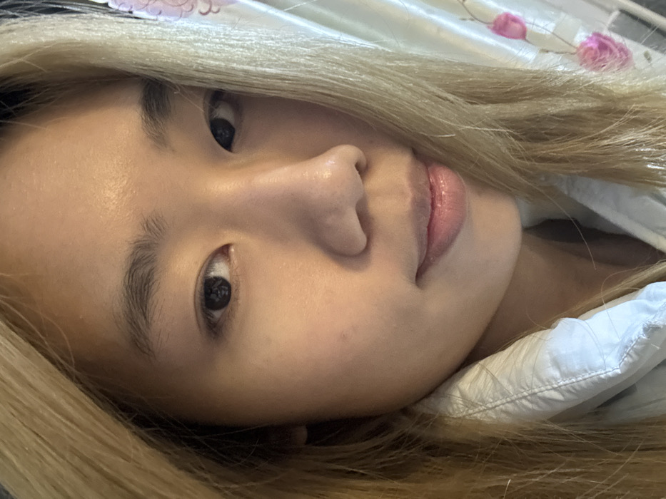 A close-up, eye-level portrait depicts a female individual with a light complexion and dark brown eyes, directly engaging the camera with a slight smile. Her hair, dyed a light blonde or golden-blonde, frames her face, with strands partially obscuring the right side. She wears a light-colored, possibly pale blue or white, collared puffer-style jacket, visible around her neck and shoulders. Her eyebrows are dark and naturally defined. The background on the right consists of a light-colored fabric, likely a curtain, featuring faint pink floral motifs. The lighting is soft and even, suggesting an indoor setting. The individual is stationary. This scene is located in Guandu, China.