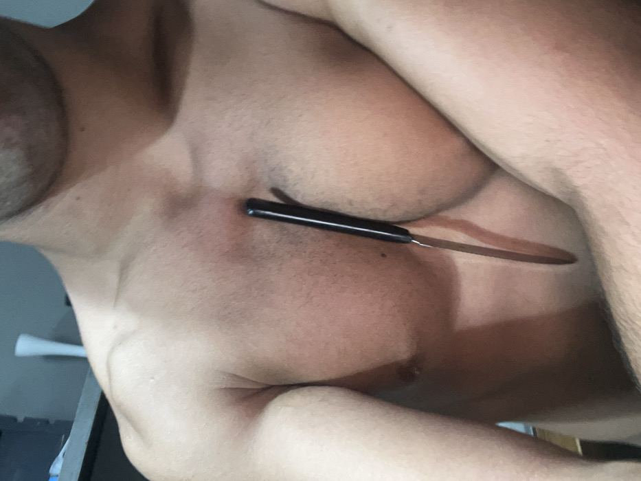 A male torso is visible, shirtless, from the upper chest to the lower sternum, including portions of both shoulders and arms. The skin tone is light, with some hair on the chest. A knife with a black handle and a silver-colored blade is positioned vertically, handle-up, on the subject's upper chest, appearing to be inserted into the skin near the sternal notch or supraclavicular area. No blood or visible injury is apparent at the point of contact. The blade casts a shadow down the center of the chest. The background is out of focus, revealing an indoor environment with what appears to be a light-colored, narrow object, possibly a vase, on a dark horizontal surface in the upper left quadrant. The scene is located in the city of Avellaneda, Argentina; specific coordinates or a precise location within the city are not discernible from the image.