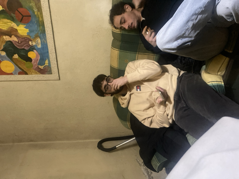 Two men are on a patterned sofa. One man lies asleep on top of the back cushions of the sofa. He is wearing a black top and light gray pants. The second man is wearing a beige hoodie with a red and white logo, black pants, and glasses. He is seated and holding a phone in his hand. A colorful painting hangs on the wall to the left. A dark object with a silver handle rests on the floor.