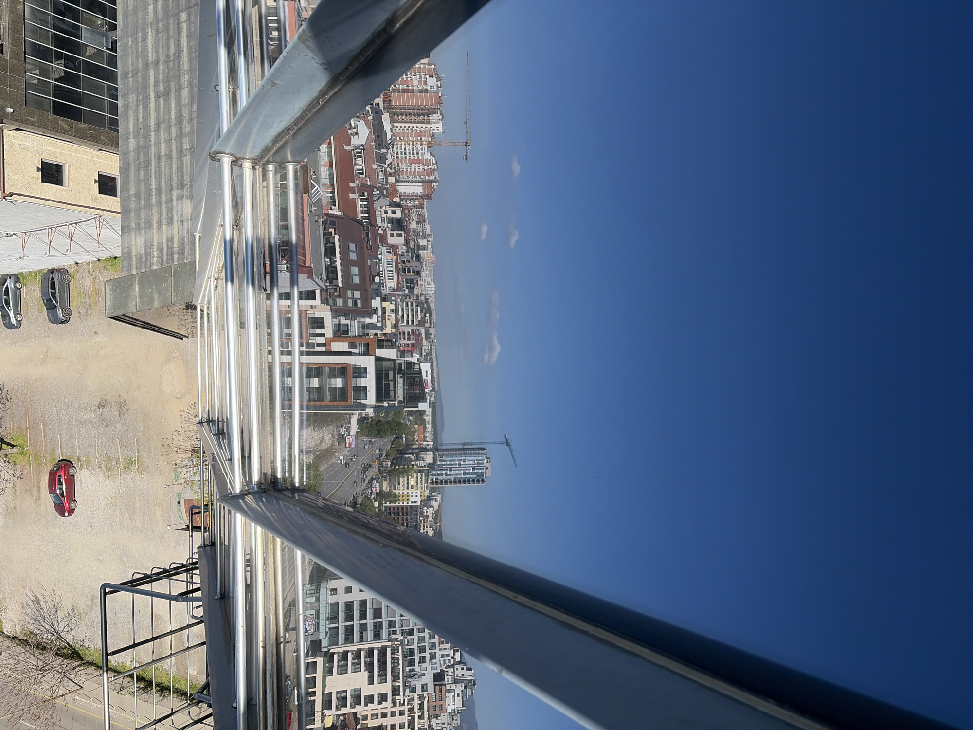 The image depicts a high-angle view of Sofia, Bulgaria, likely taken from a high building or structure. The foreground includes metal framework, potentially a railing or part of the building's infrastructure. The cityscape consists of buildings of varying heights and architectural styles, with a mix of residential and commercial structures. A construction crane is visible in the midground. The sky is clear and blue. On the left side, below the point of view, there is what appears to be a parking lot with a red car and two grey vehicles.