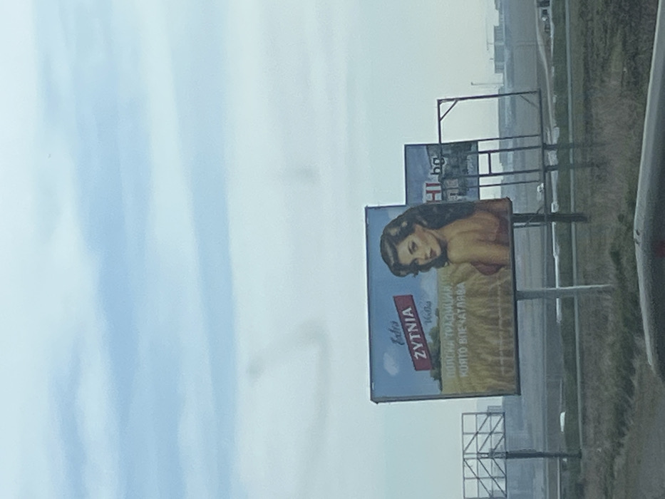The scene depicts a roadside environment in the city of Burgas, Bulgaria. In the midground, a large rectangular billboard stands on a metal support structure. The billboard displays a blue sky at the top, transitioning to a golden wheat field. A red banner with white text reads "Extra ZYTNIA VODKA." To the right, a stylized image of a woman with dark, wavy hair and bare shoulders is depicted, looking towards the viewer. Below the banner, Bulgarian text translates to "POLISH TRADITION THAT IMPRESSES." To the right and slightly behind this billboard, another billboard structure is partially visible, displaying blue and white content with ".bg" text. Further to the right, a skeletal metal frame of a third billboard stands empty. Below the billboards, an expanse of unkempt grassy ground leads to a multi-lane road or highway, where indistinct vehicle outlines are visible in the distance. The background features a horizon line with several hazy industrial or urban structures. The sky is overcast with a light blue-grey hue, containing several faint dark spots consistent with lens artifacts or dust on a camera sensor. The image appears to be captured from inside a vehicle, with a dark, curved object, likely part of a dashboard or hood, visible at the bottom edge.