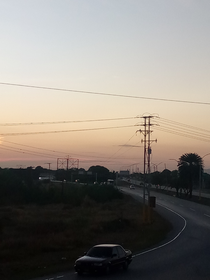A serene sunset casts a warm glow over a highway scene. Power lines stretch across the sky, intersecting with a utility pole. A lone car travels along the curving road, flanked by vegetation. In the distance, additional vehicles and structures, including a large metal sign frame, dot the landscape. Palm trees are visible on the right side of the road.