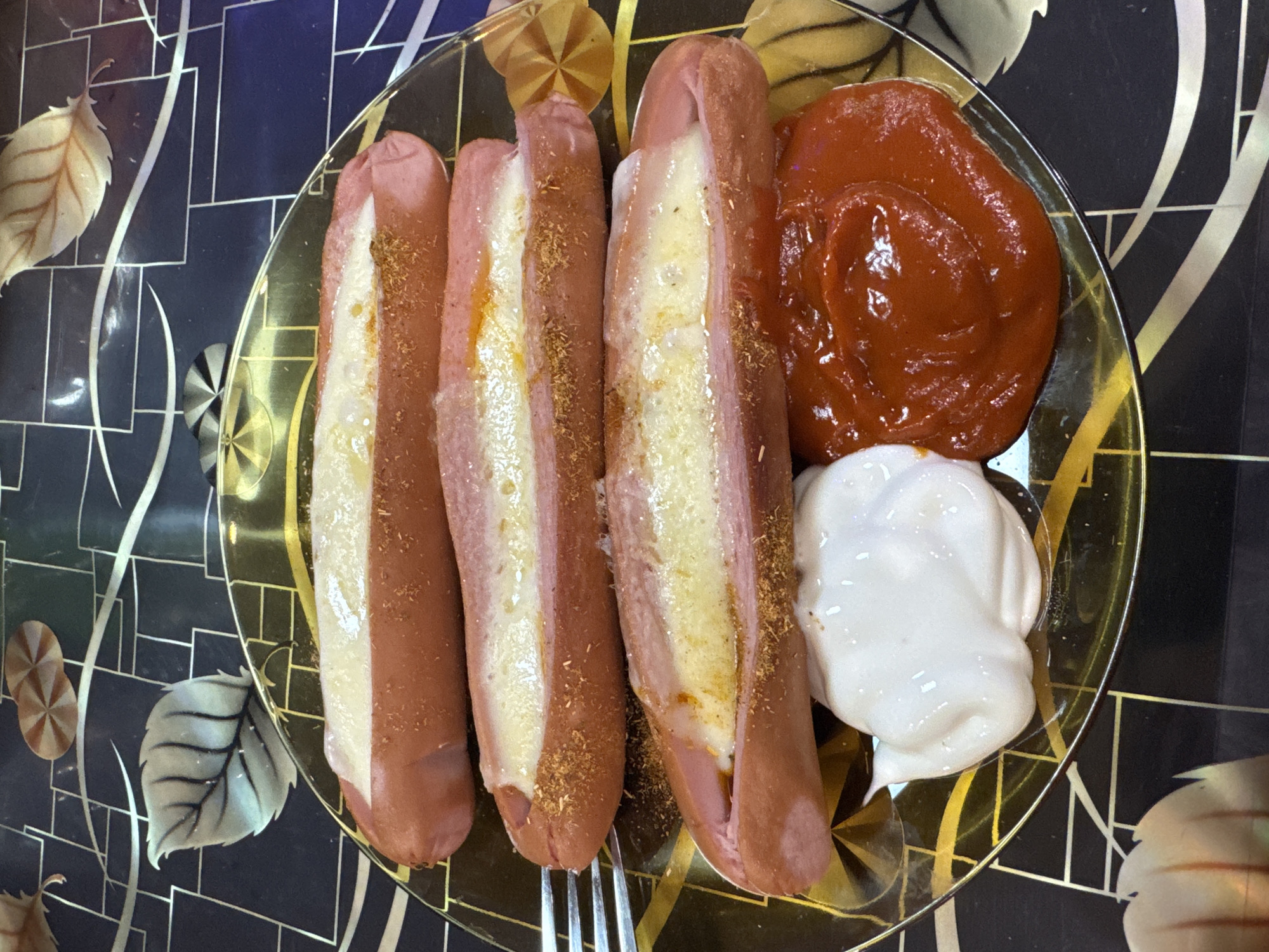 - "The scene depicts a clear glass plate containing three prepared sausages, resting on a dark, patterned surface in Dryanovo, Bulgaria" by FM-DxVzx2, licensed under CC BY 4.0