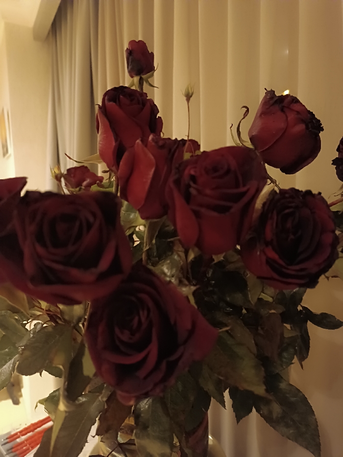 A bouquet of deep red roses dominates the scene, some fully open, others still buds. The roses exhibit a velvety texture with intricately curled petals. Green leaves are interspersed among the blooms. The background consists of off-white curtains and a soft, diffused light. The arrangement is set indoors, lending a warm and intimate atmosphere. The roses, though partially withered, possess a romantic and slightly melancholic quality.