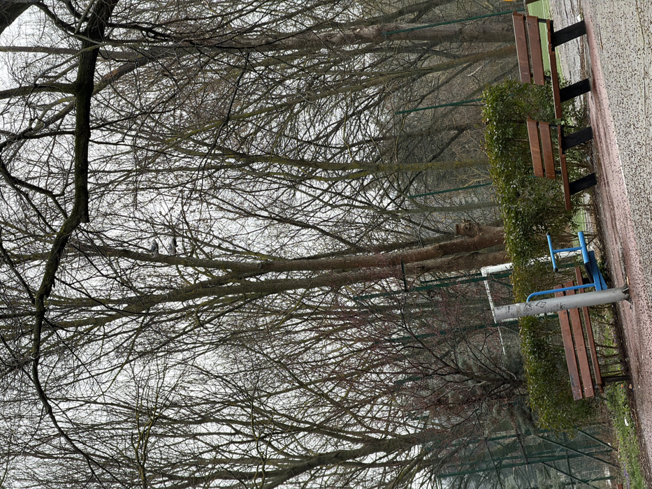 The image displays an outdoor park scene in Dobrich, Bulgaria, characterized by an overcast sky and wet ground, suggesting recent precipitation. The foreground features a reddish-brown paved surface, speckled with small dark particles. Three unoccupied wooden park benches, each with dark support legs, are positioned in a line on the right side of this paved area. To the left of the benches, a piece of outdoor exercise equipment stands, composed of a tall, light-gray metallic post with blue-colored handles or footrests, and minor markings on its surface. Behind the benches and equipment, a neatly trimmed line of green evergreen bushes acts as a low hedge. Beyond the hedge, a green wire mesh fence is visible, enclosing what appears to be another section of the park or a sports area. The mid-ground and background are densely populated with numerous bare deciduous trees, their intricate network of branches and twigs dominating the upper portion of the frame against the light-gray sky. Notably, a pair of light-colored shoes is suspended by their laces from a tree branch in the upper-middle section of the image. No individuals are present in the scene.
