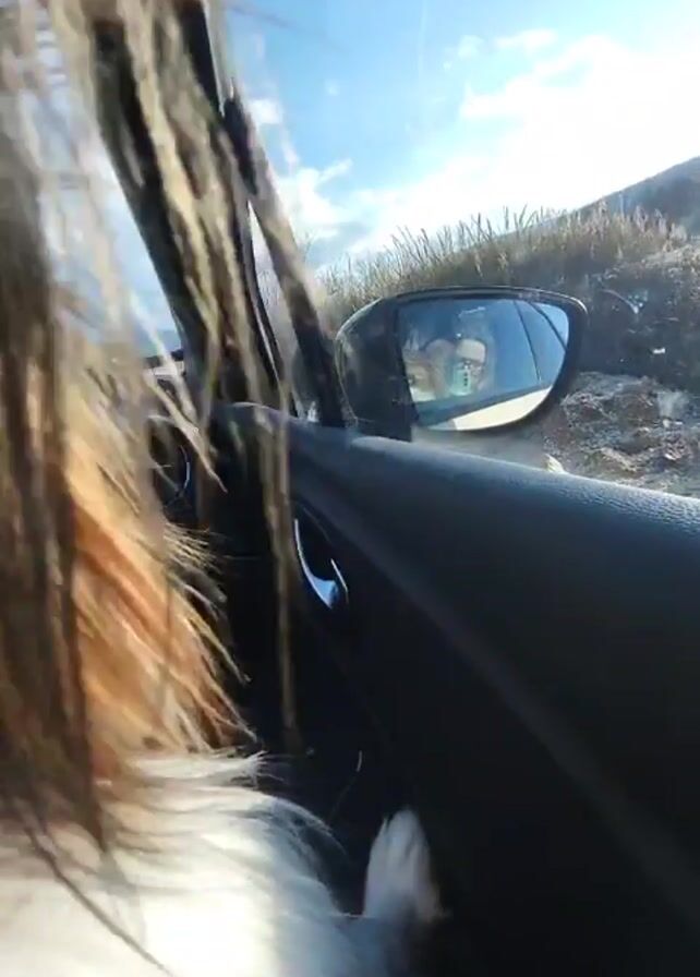 A dog is in a moving car, with its head and part of its body visible. The dog has long, brown and white fur. The camera's perspective is from inside the car, next to the dog. The car window is partially open, allowing the dog's fur to blow in the wind. The car's side mirror is visible, reflecting the driver, who is wearing glasses. The background outside the car includes a clear blue sky with light clouds, and a roadside area with vegetation. A "For Sale" sign is visible in the background. The car appears to be moving on a road.