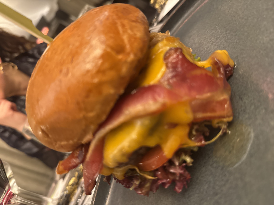 A close-up shot displays a gourmet burger. The burger features a glazed bun, melted cheese, several slices of crispy bacon, and lettuce. It seems to be placed on a dark grey plate and it is skewered together. The photo is taken at a slight angle, giving an upper perspective on the burger. A person can be seen holding a beverage in the background.