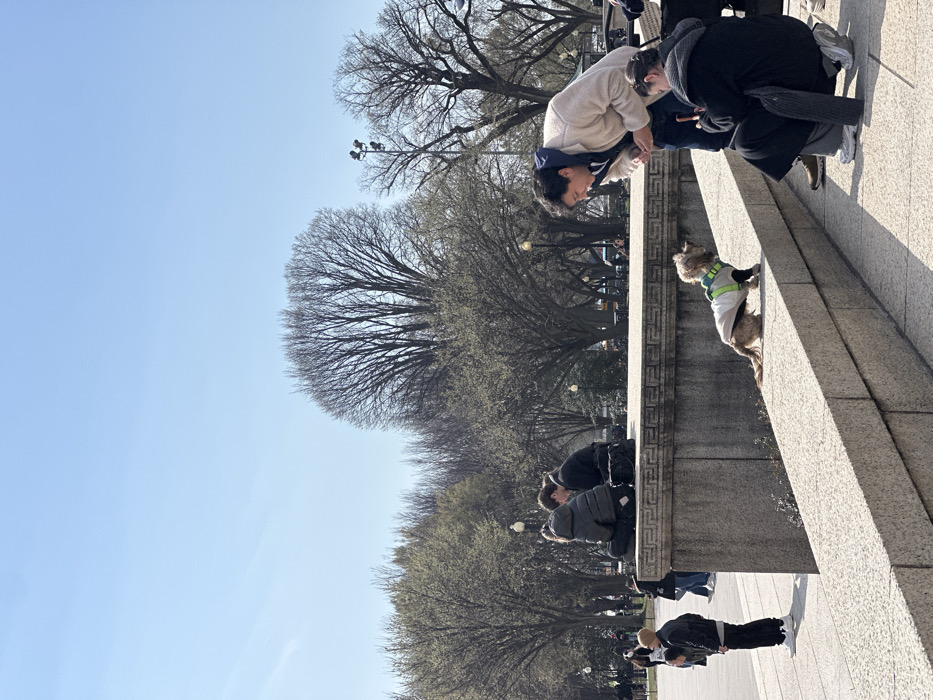 The scene is set in a public outdoor area in Washington, D.C., specifically at the World War II Memorial on the National Mall. In the foreground, a multi-tiered stone wall, constructed of light-colored granite or similar material, rises from the bottom of the frame. The uppermost visible tier of this wall features a carved Greek key pattern frieze. A small, long-haired dog, light brown in coloration, is positioned on the second-lowest visible tier of the stone wall, facing to the right. It wears a light-colored coat, possibly white or beige, with a neon green harness. Two adult individuals are interacting with the dog from the paved ground level below the wall. A male subject, with dark hair, wearing a beige sherpa-style jacket over a blue hoodie, is bent at the waist, leaning towards the dog with his mouth slightly open. To his right, a female subject, with dark hair, is crouched low, holding a dark object consistent with a smartphone directed towards the dog, appearing to capture an image or video. A third individual, partially visible on a lower paved area to the far left, wears a dark jacket and white sneakers, facing away from the camera. In the midground, on the top level of the stone wall, two additional individuals are seated, facing each other. One wears a dark puffer jacket. The background is dominated by numerous deciduous trees, mostly bare of foliage, suggesting late winter or early spring. Public walkways with several other pedestrians are visible among the trees. Multiple streetlights and a tall, multi-headed light fixture are present within the tree line. The sky above is clear and light blue, indicating fair weather.