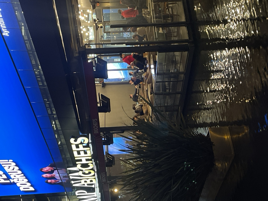 A restaurant called Big Chefs is visible at night with people dining inside. The restaurant has glass windows and an outdoor seating area. Reflections of the building and lights shimmer on the surface of water in the foreground. A large bush is in front, partially obscuring the view. A blue sign with Turkish writing is on the left side of the building.