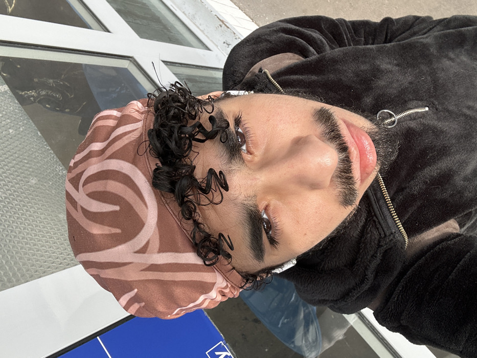 This image depicts a high-angle, close-up portrait of an individual situated in Orsay, France. The subject is a male with dark, curly hair visible at the forehead, prominent eyebrows, a mustache, and a goatee. They are wearing a close-fitting head covering in a muted brown-pink hue, adorned with a lighter, abstract pattern that includes stylized interlocking letters, resembling "GG." A black, textured quarter-zip pullover, secured with a brass-colored zipper, is visible on their torso. White wireless earbuds are inserted into both ears. The background elements include a partial vertical blue sign with white lettering on the left, and a window with white framing reflecting an indistinct dark object, positioned above a grey, textured wall or surface to the right.
