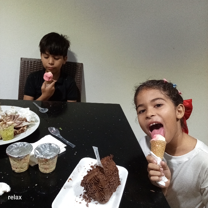 A boy and girl sit at a black table enjoying desserts. The boy holds a pink ice cream treat, looking contemplative. The girl excitedly licks a cone of ice cream, her mouth wide open. In front of them, the table is covered with food: a plate with leftover meat, two desserts in foil-covered cups, and a slice of chocolate cake on a white plate. The word "relax" appears in the lower-left corner.