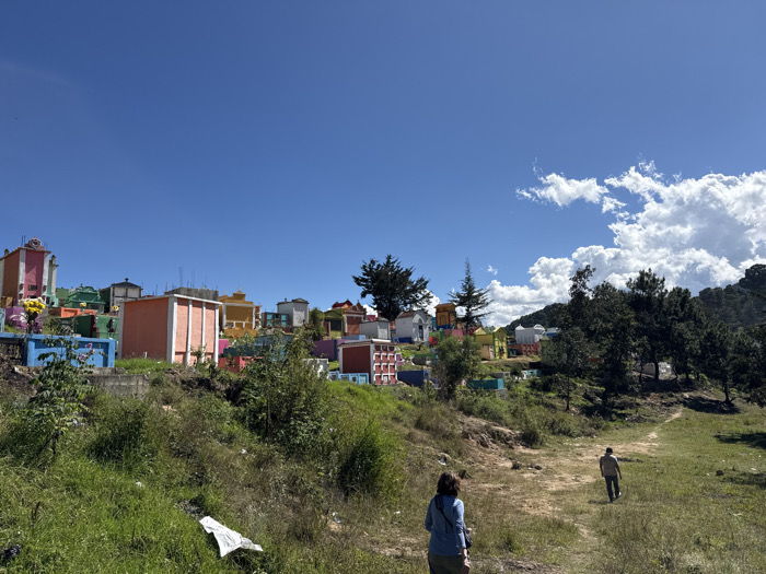 A colorful cemetery sits on a hill beneath a clear blue sky dotted with fluffy white clouds. The structures are painted in vibrant shades of orange, pink, yellow, and blue. Two people are walking along a path in the foreground, with grassy slopes and trees surrounding them. The scene evokes a sense of cultural vibrancy and peacefulness in a natural setting.