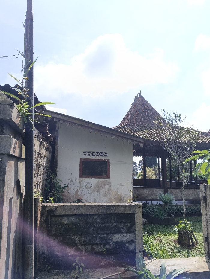 An outdoor scene shows a white-walled structure with a small, rectangular window and a tiled roof. To the side stands an open-air pavilion with a tall, tiled pyramid-shaped roof. Greenery and small trees surround the buildings, suggesting a garden setting. A weathered concrete fence with plants growing on it frames the foreground, while a utility pole with climbing vegetation is visible to the left. The sky is blue with scattered white clouds.