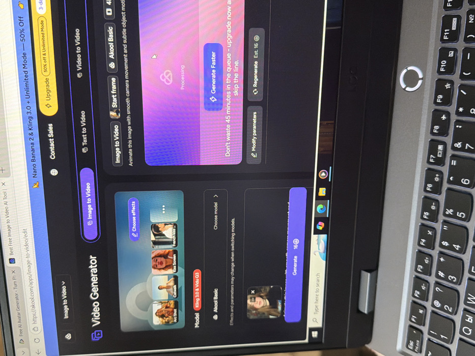 The image displays an Acer laptop in Debelets, Bulgaria, viewed from a slight overhead angle, focusing on its screen and upper keyboard area. The laptop screen shows the Akool.com "Video Generator" web application, specifically the "Image to Video" interface. The browser address bar shows `https://akool.com/apps/image-to-video/edit`, with "Free AI Avatar Generator" and "Best Free Image to Video AI Tool" visible in other tabs. The application's left panel features "Choose effects" with four example thumbnails: "Arc Shot," "Catwalk," "Kiss Screen," and "French kiss...". Below this, a section for "Model" selection (Kling 3.0 & Vidu Q3, Akool Basic) is present, with a square preview of a young woman's image awaiting generation. The right panel indicates a "Processing" status within a purple-to-pink gradient box, with a "Generate Faster" button and text stating, "Don't waste 45 minutes in the queue - upgrade now an[d] skip the line." "Modify parameters" and "Regenerate Est. 16@" buttons are also visible. The Windows taskbar is partially visible at the bottom of the screen. The laptop's visible keyboard section has a gray finish with black keys, featuring a QWERTY layout augmented with Cyrillic characters, consistent with a Bulgarian keyboard. A circular power button with an illuminated ring is situated above the F10 key. The background beyond the laptop is out of focus, suggesting an indoor setting.
