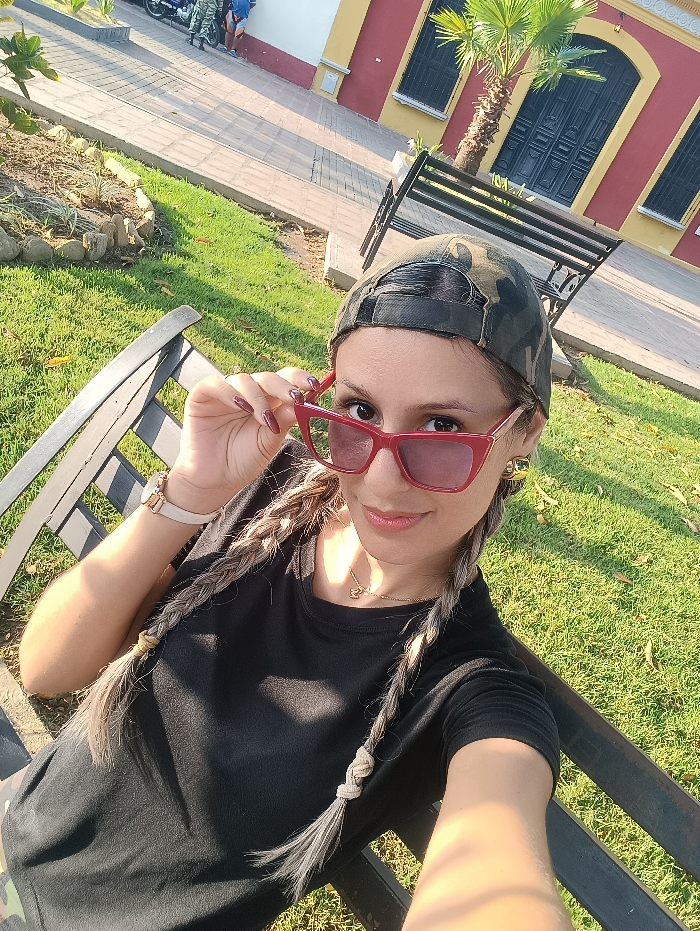 A woman sits on a park bench, taking a selfie. She wears a black t-shirt, camouflage hat, and red sunglasses, which she's adjusting. Her blonde hair is styled in braids. The background shows a grassy area, a building with red and yellow walls, and a palm tree. Other park benches are visible, and people can be seen in the distance. The sunlight is bright.