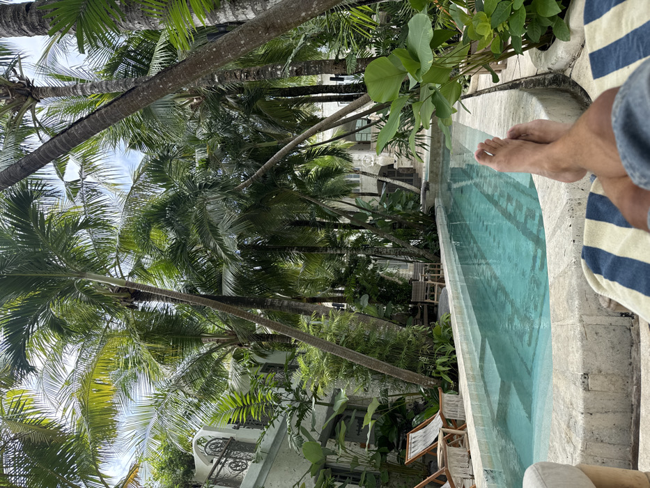 A relaxed poolside scene shows a person's feet, blue striped towel, and denim shorts at the edge of a turquoise pool. Lush palm trees and tropical foliage surround the pool area, creating a shaded and secluded atmosphere. In the background, a glimpse of white buildings with wrought iron details can be seen through the trees. Lounge chairs are positioned near the water, suggesting a peaceful and vacation-like setting.