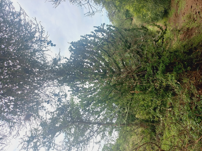 A verdant path winds through a forest. Lush green vegetation blankets the landscape. A tall, branching cactus stands prominently, its arms reaching skyward. Trees frame the path, their leaves creating a dense canopy. The sky peeks through the foliage. The overall impression is one of a dense, natural environment.