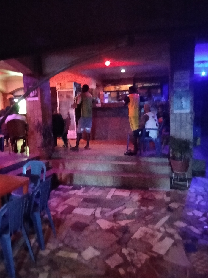 The image depicts an interior or semi-enclosed establishment located in Ankpa, Nigeria, under dim, multi-colored ambient lighting dominated by red, blue, and purple tones