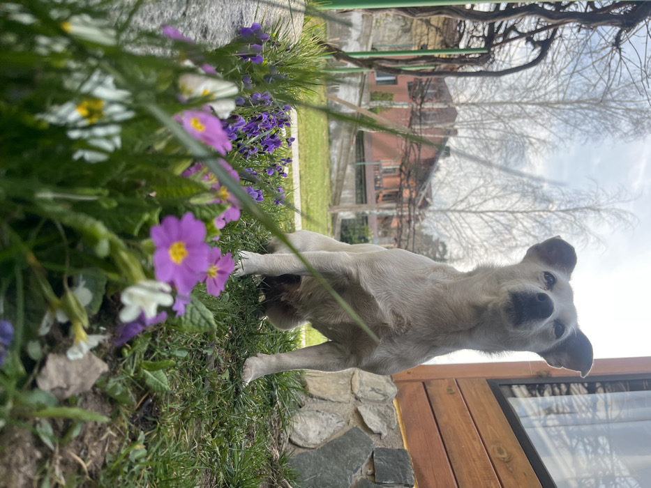 A light-colored, short-haired dog sits on a grassy slope in a residential garden in Vladaya, Bulgaria
