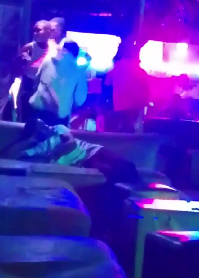 several people dancing in a nightclub. One person is reclining on a raised platform made of upholstered seating. The club is lit with bright purple and blue lights.